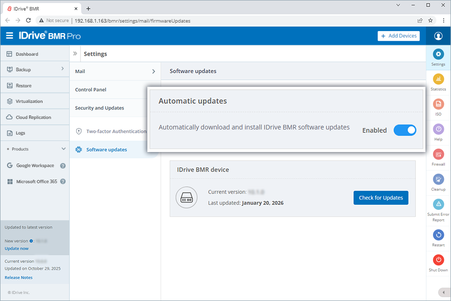 You can enable automatic software updates directly from the IDrive BMR device interface.