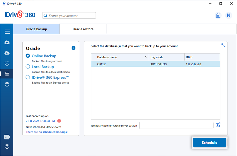 Yes. The IDrive 360 desktop application allows you to select a network location for the temporary backup directory during remote Oracle server backups. Select the temporary directory on the computer where the Oracle server service is running. Ensure that the selected directory is mapped from the remote computer and has sufficient space to hold the Oracle server backup resources.