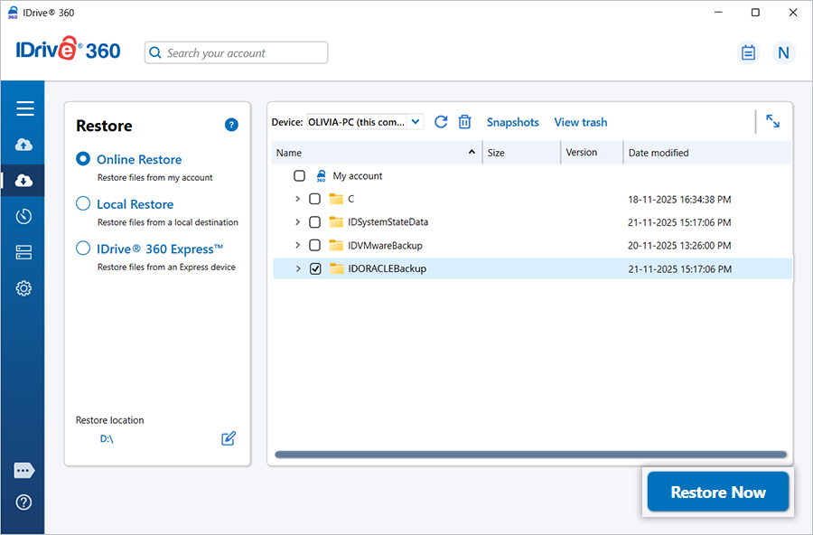 3. Locate and select the ‘IDORACLEBackup' folder from your IDrive 360 account or local drive.