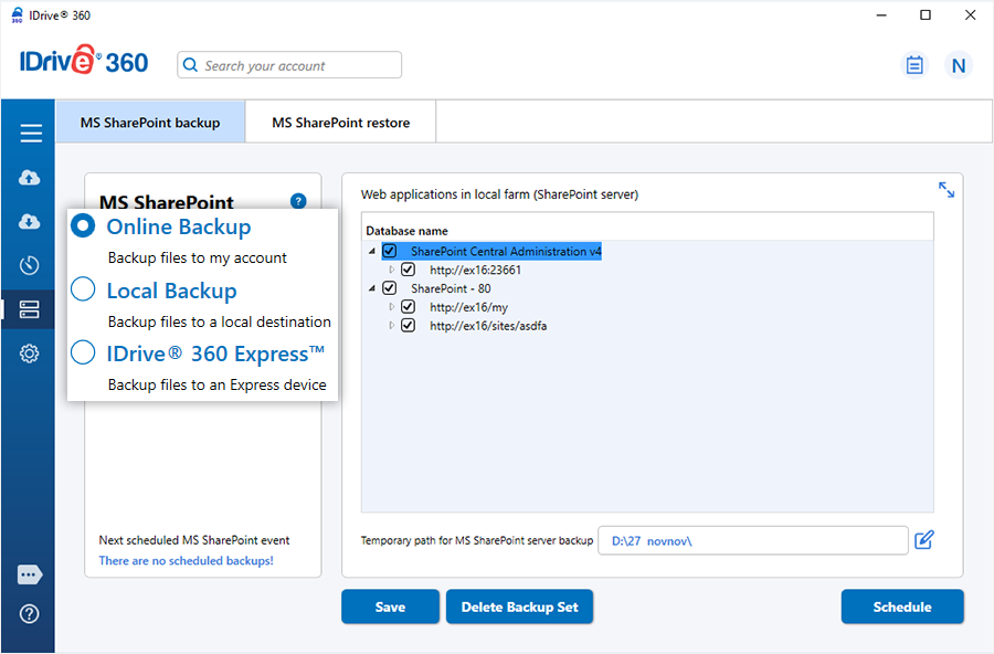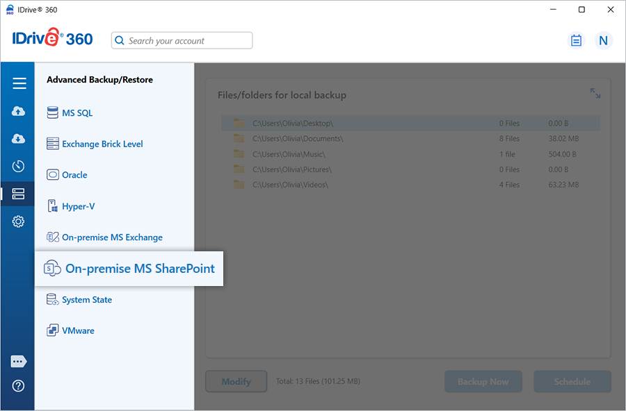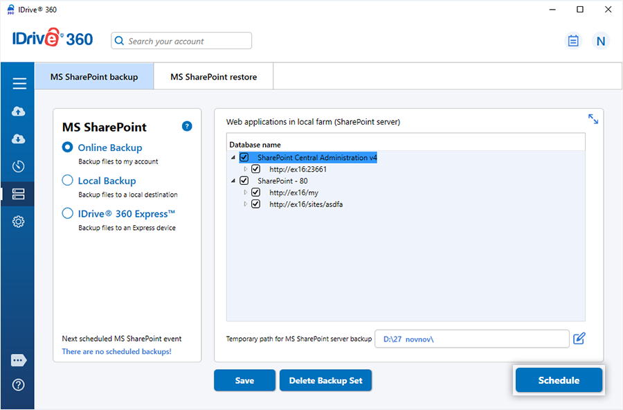 You can manually back up the 12, 14, 15, and 16 hive folders by selecting them from your SharePoint server using IDrive 360. These folders are typically located in the SharePoint installation directory: