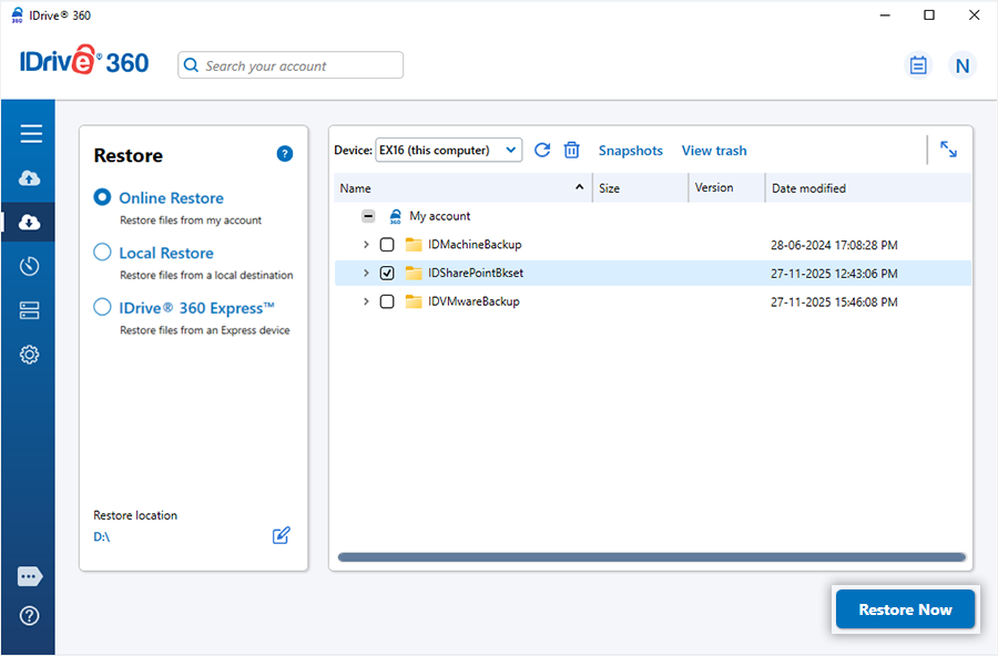 2. Select 'Online Restore', 'Local Restore', or 'IDrive 360 Express™ Restore'.