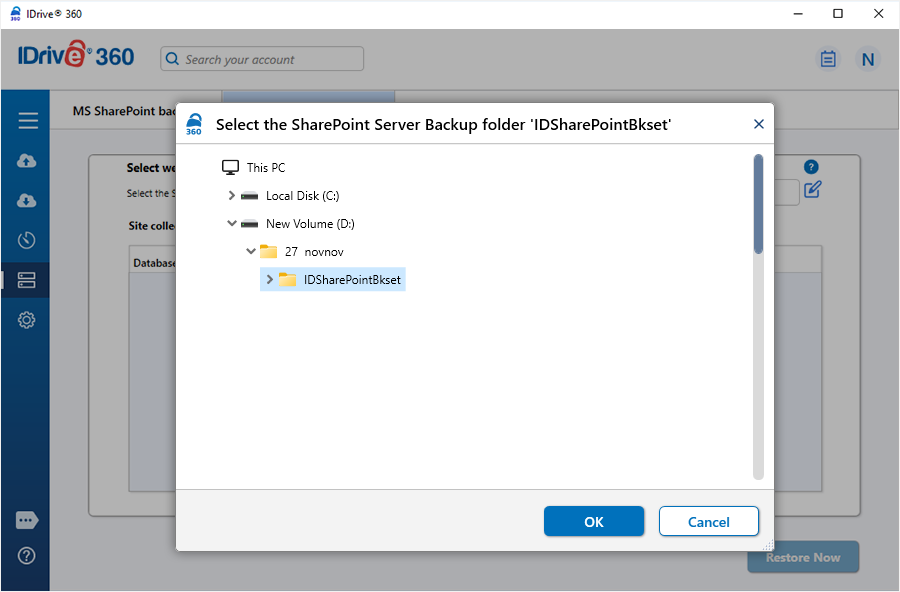 3. Locate and select the 'IDSharePointBkset' folder in your IDrive 360 account or local drive.