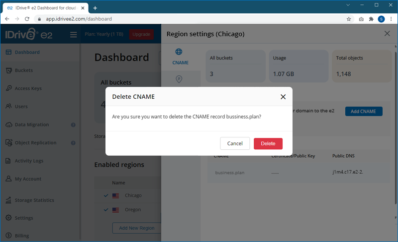 Yes, you can replace IDrive® e2 specific region domain names with your own domain names. You need to create a CNAME record for your domain name server and point that to your e2 region domain name. The Dashboard on the web console lists the IDrive® e2 specific domain names of each enabled region.