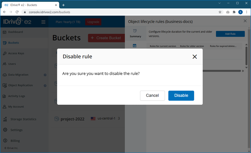 To disable an object lifecycle rule, click corresponding to the rule, and click 'Disable' in the popup.