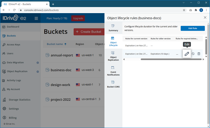 To edit the object lifecycle rule, click corresponding to a rule. Modify the rule as required and click 'Update Rule'.