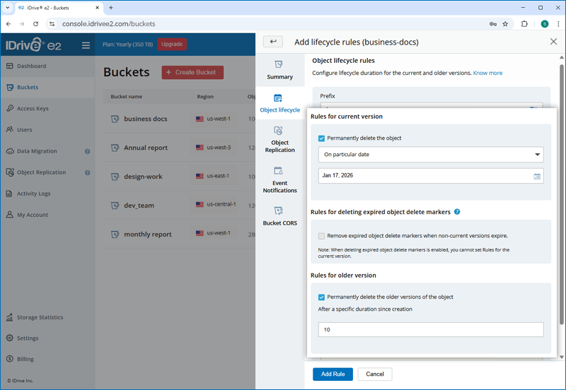 Note: When you enable 'Versioning', you can choose to enable 'Retention' for a specific bucket under IDrive e2 > 'Bucket summary' to prevent accidental deletion of data in a bucket, for a time period.