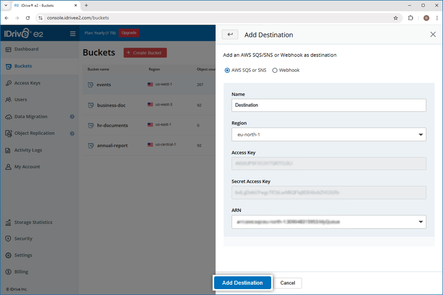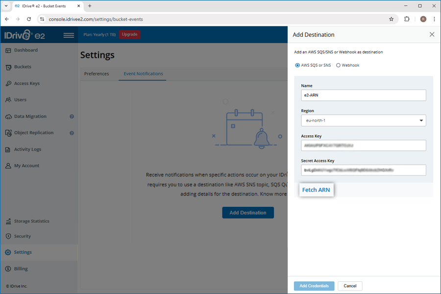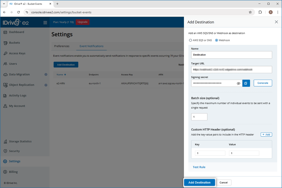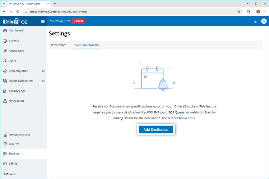 - Navigate to 'Event Notifications' and click 'Add Destination'.