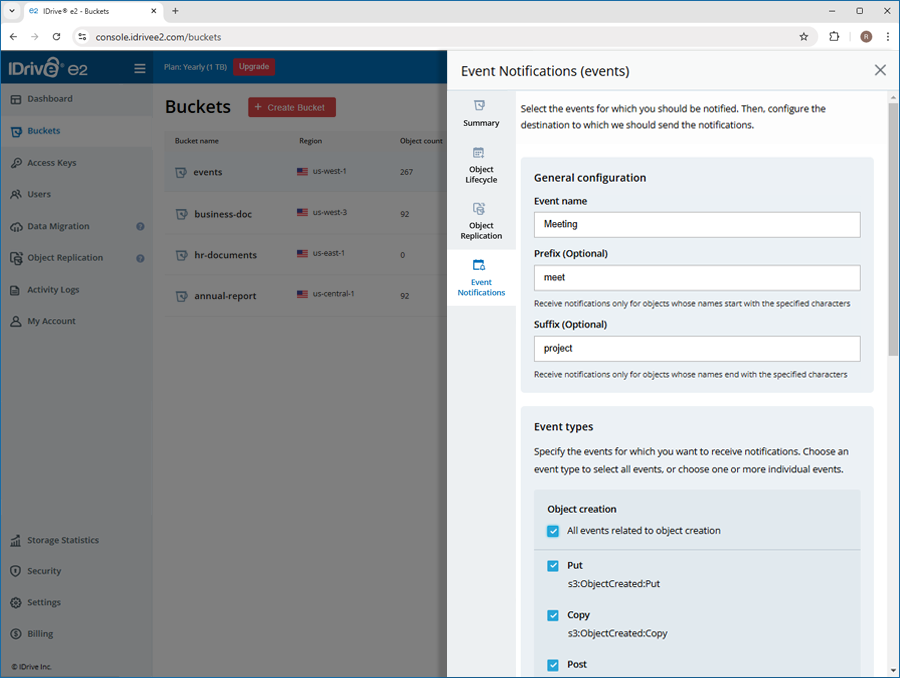 - Suffix (Optional): Specify a suffix to receive notifications only for objects whose names end with the specified characters.