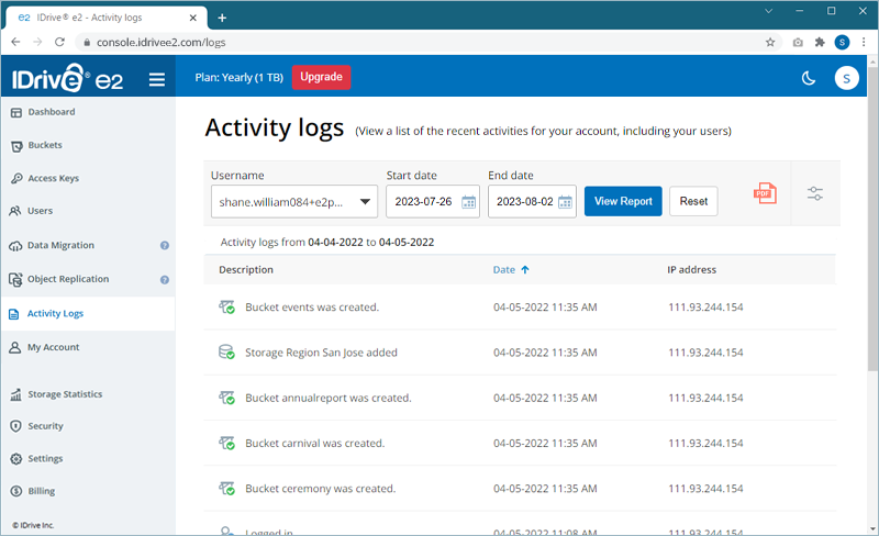 Note: Only the admin of the IDrive® e2 account will be able to view the activity logs for their users.
