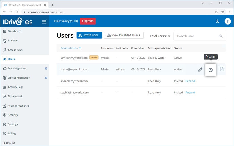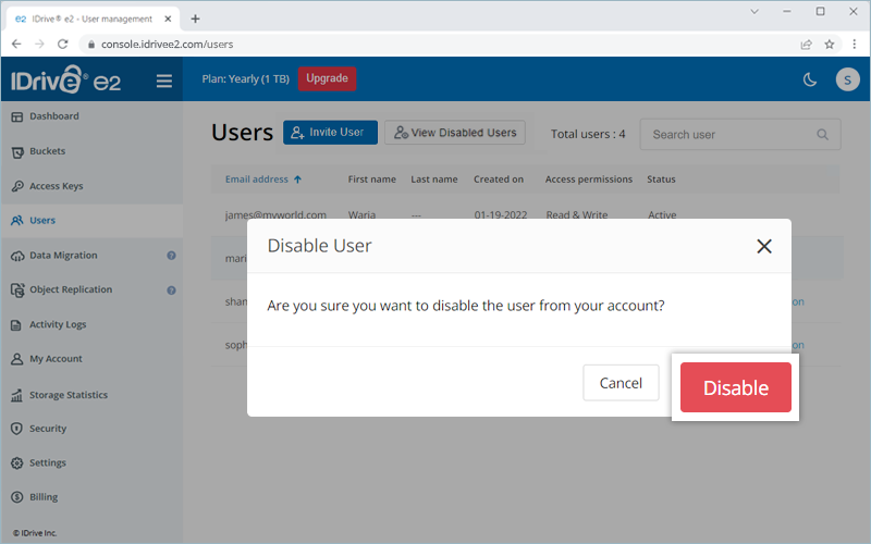 - In the pop-up window, click Disable. The user account will be disabled and they will no longer be able to sign in to their IDrive® e2 account.