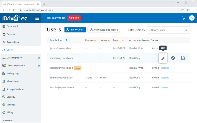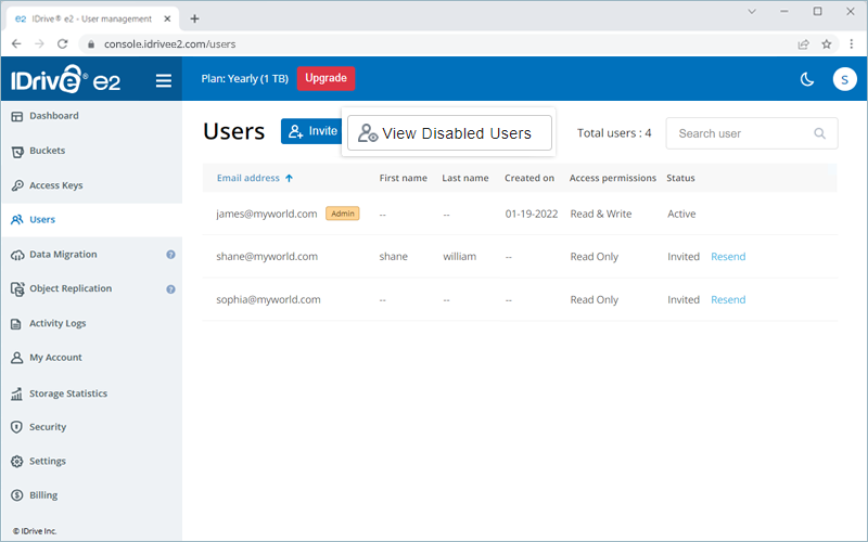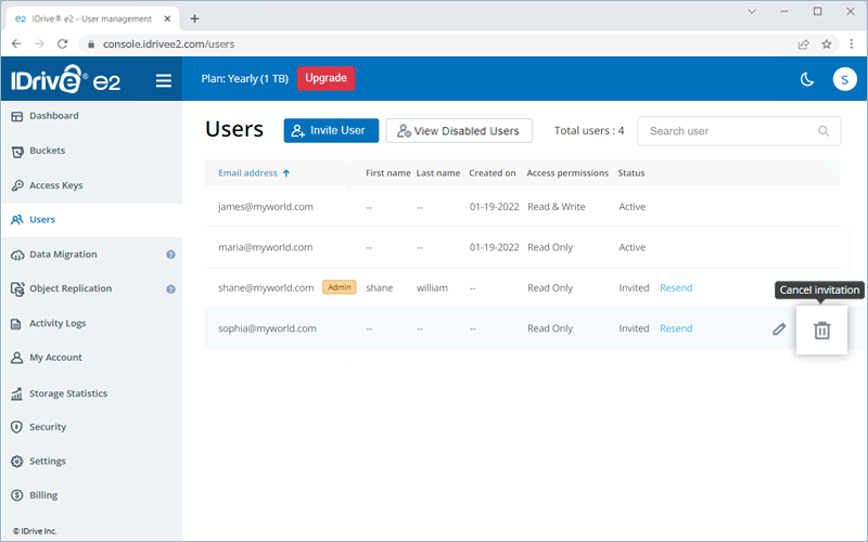 The invited users will receive an email with an activation link to create an IDrive® e2 account. Once the user creates an account, the user will be displayed under the Users tab. You can also view the status of the pending invitations and resend or cancel an invite.