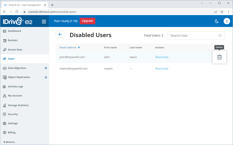 Deleting a user account will cancel their account and prevent them from signing in to their IDrive® e2 account.