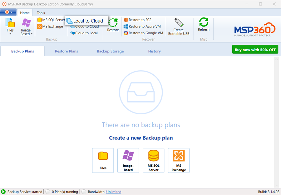 - Click Local to Cloud and then click Next in the Create Backup Plan Wizard.