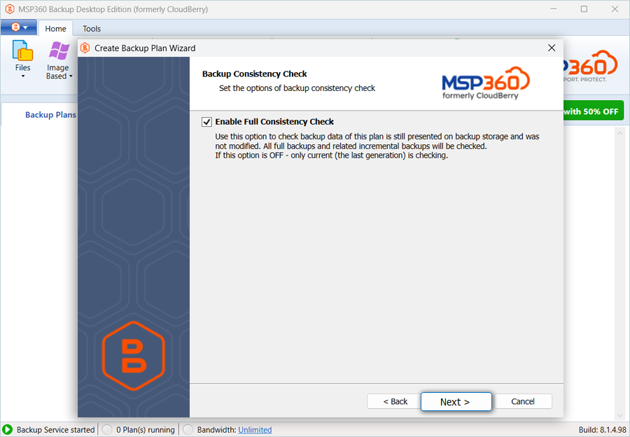 - Select/deselect the Enable Full Consistency Check checkbox as needed, and then click Next.