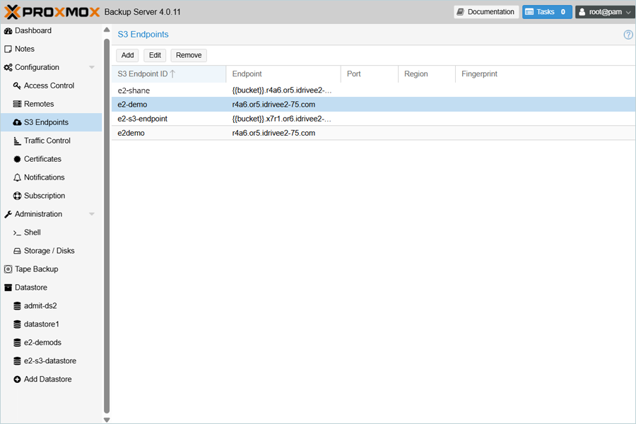 - Select S3 Endpoints under Configuration and then click Add to add your IDrive e2 cloud as a new S3 Endpoint.