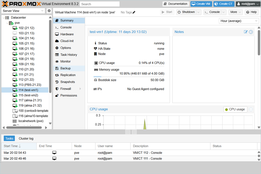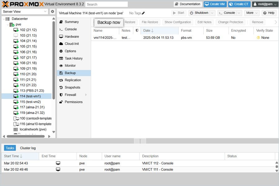 - In the Proxmox Virtual Environment, select the Virtual Machine that you want to back up.