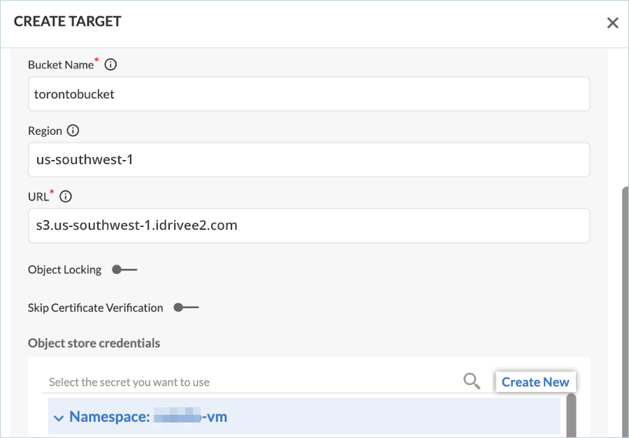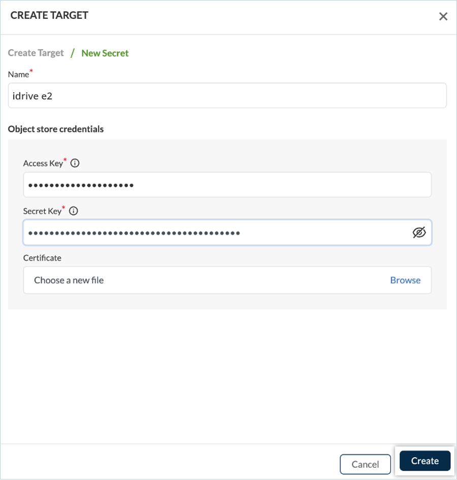 - Provide a name for the Target/New Secret, enter the corresponding Access Key and Secret Key created earlier, and click Create.