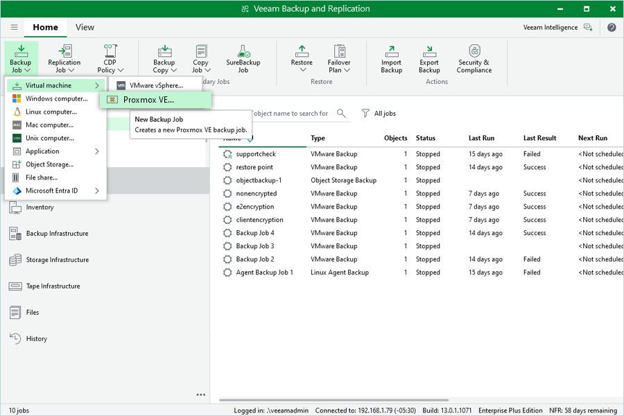 - In the New Backup Job window, click Virtual Machine, then select Proxmox VE.