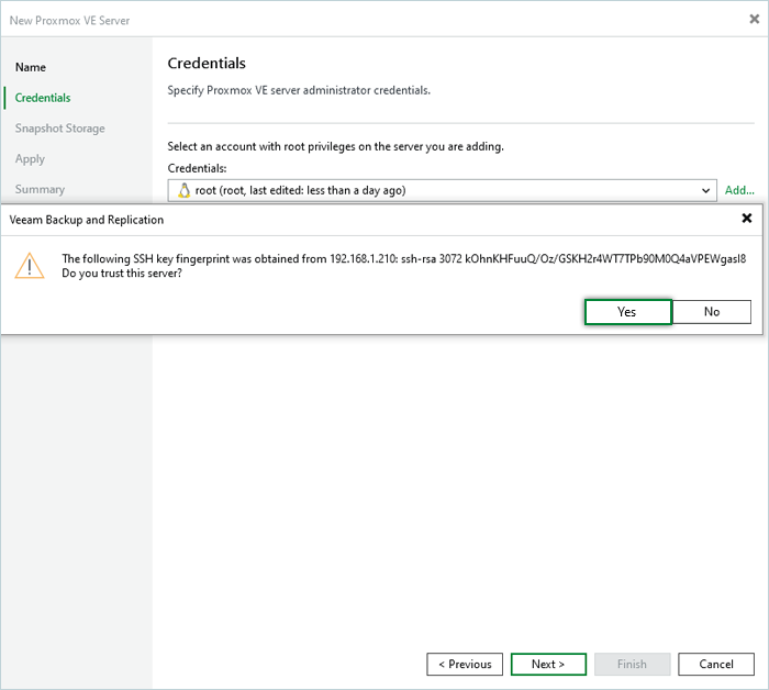 - Click Yes in the SSH Key confirmation pop-up, then click Next.