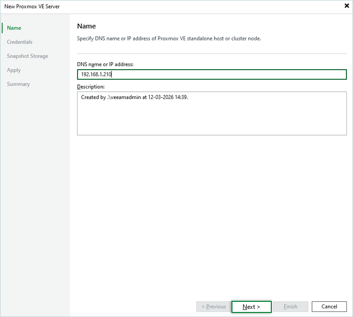 - In the New Proxmox VE Server window, enter the DNS Name or IP Address of the server. Click Next.