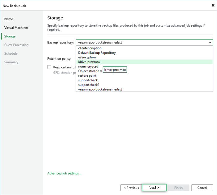 - In the Storage tab, click the Backup Repository list, select the repository added in the previous step, and click Next.