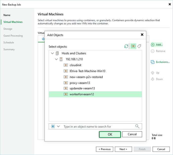 - Click the Add in Virtual Machines tab to select the Proxmox virtual machine for backup.